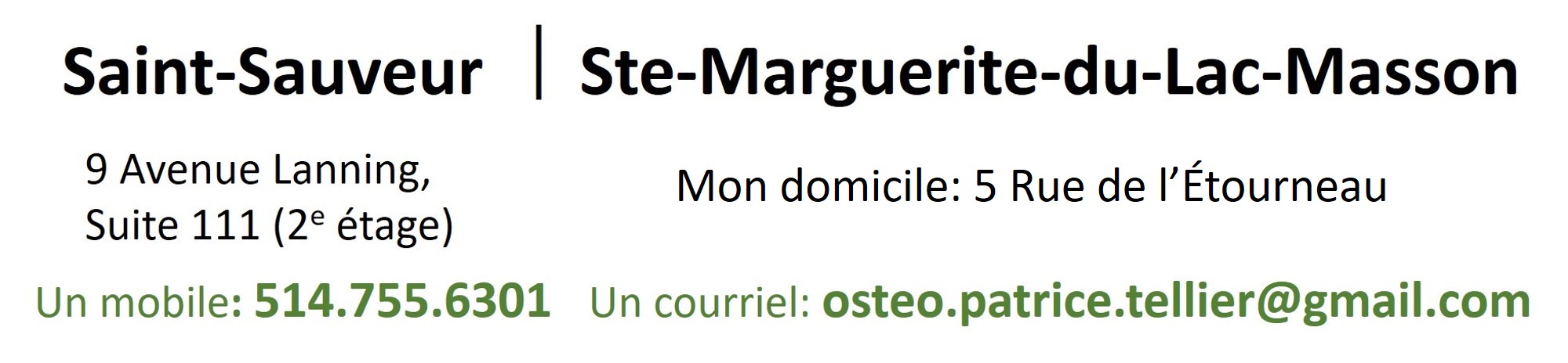 Bonjour, mon nom est Patrice Tellier. Résident de Sainte-Marguerite-Du-Lac-Masson depuis avril 2022, j'offre mes services en tant qu'ostéopathe à ma communauté (à mon domicile), ainsi qu'à mon cabinet principal de Saint-Sauveur (au sein de la clinique d'esthétique EvaCorps). Mon parcours: d'abord une maîtrise en biochimie/biologie. Suivie de 15 ans comme assistant de recherche en laboratoire (cancer de la prostate, diabète). Puis 8 ans comme chef de produit diagnostique dans le domaine de la biopharmaceutique. Par la suite, diplôme de l'Institut d'Enseignement de l'Ostéopathie du Québec (IEOQ) en temps complet durant 3 ans, avec présentation d'un mémoire sur: La prise en charge de la Maladie de Crohn en Ostéopathie. Suivi par 6 ans de pratique à temps plein à mon cabinet de Verdun (Montréal). Et une année en tant qu'enseignant à l'IEOQ (Ostéopathie Viscérale, Ostéopathie des Fascias). Ma formation ostéopathique inclut l'étude des domaines suivants: